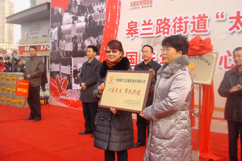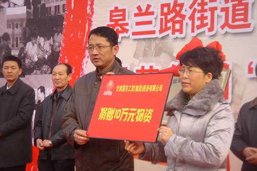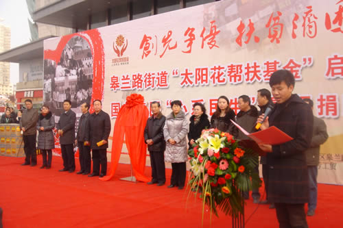 2012元月6日下午3時,甘肅國芳集團聯(lián)合城關(guān)區(qū)皋蘭路街道黨工委、辦事處舉行了“創(chuàng)先爭優(yōu)、扶貧濟困”太陽花幫扶基金啟動儀式,充分體現(xiàn)民生為本的服務宗旨,著力搭建社會幫扶救助平臺,切實解決弱勢群體實際困難,促進和諧街道建設。
